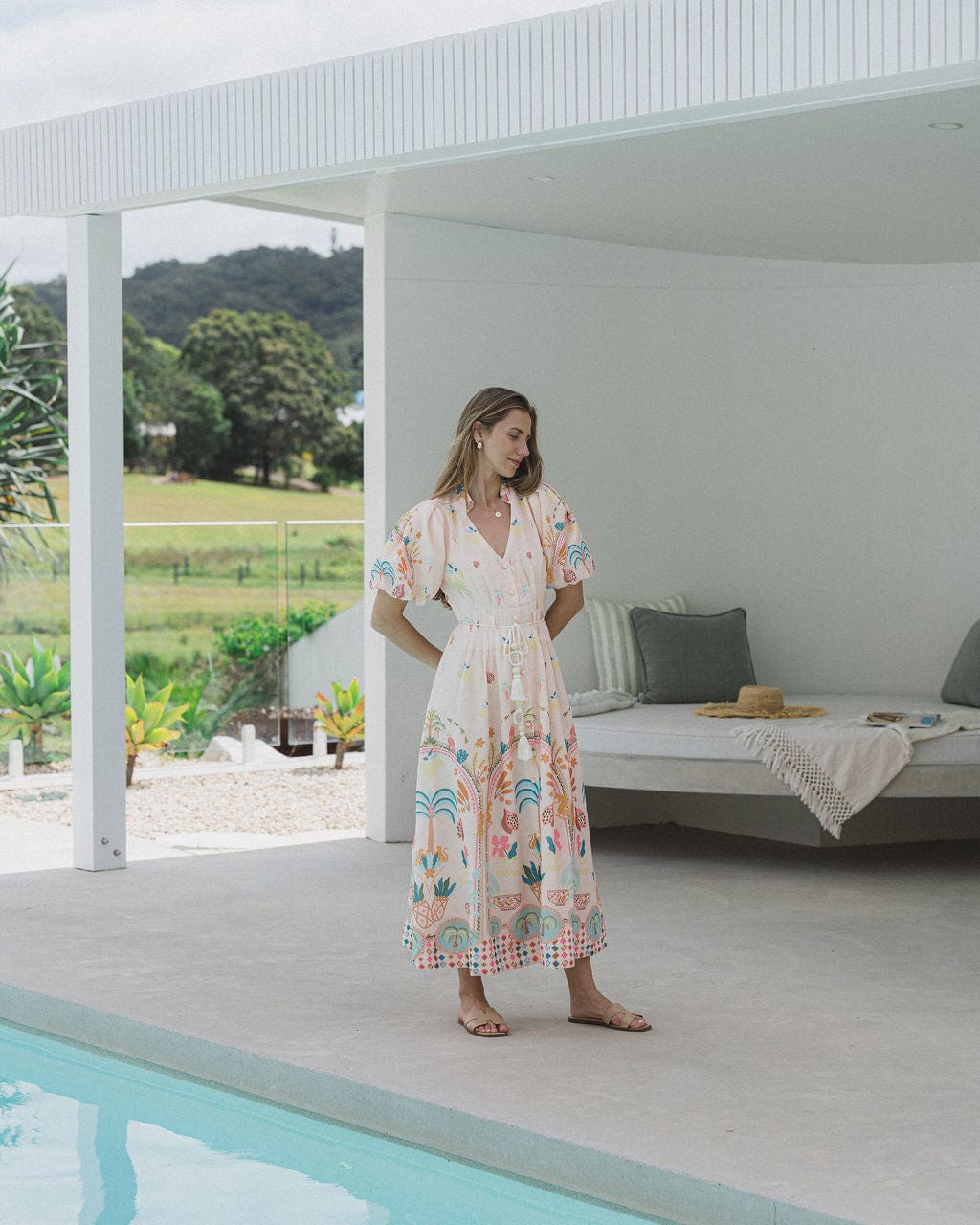 This stunning dress channels all the Palm Springs vibes with its creamy pink colourway, stunning palm print and pretty detailing including balloon sleeves and crochet buttons.