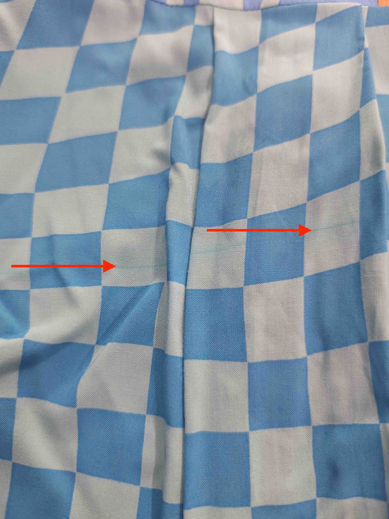- Blue ink run across the width of the back of the dress. Faint but noticeable.