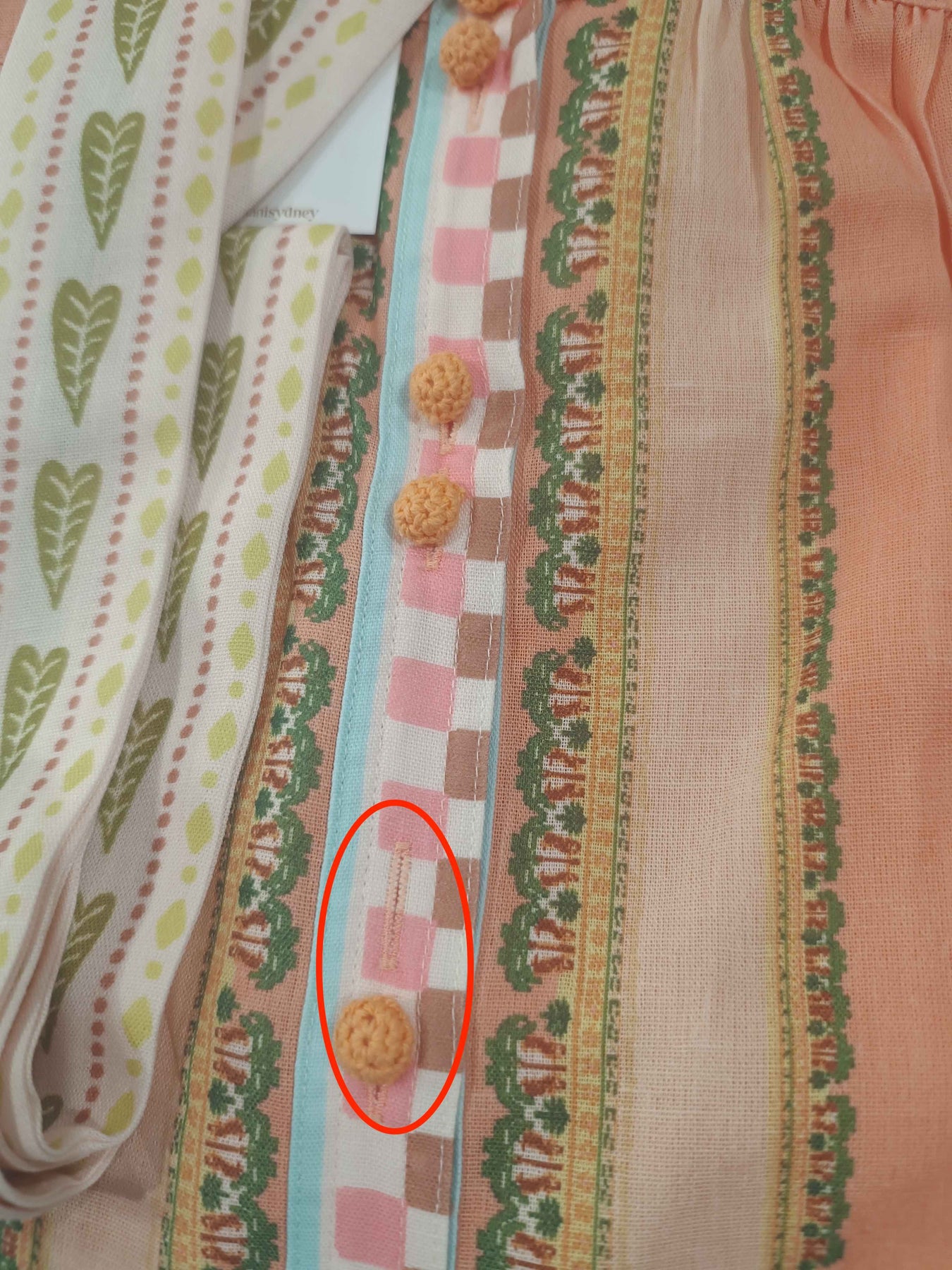 A printed belt adds visual interest to the dress and cinches in the waistline for an even more flattering fit. Hand crocheted buttons add a unique and pretty detail.